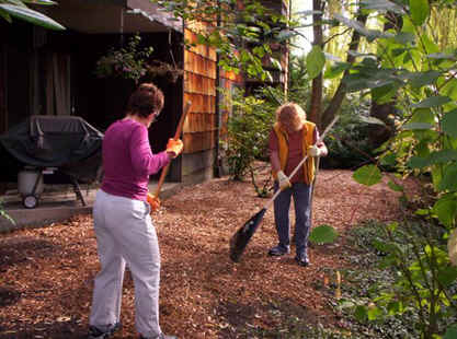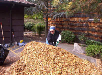 The volunteers from Ravenna Woods are also covering level areas around the creek with bark mulch (small-nugget size). This will help the soil retain more moisture and keep weeds out.